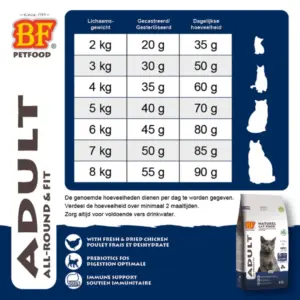 BF® Adult. Nederlandse topkwaliteit. Hoogwaardige, volledige, natuurlijke premium kattenvoeding die ontwikkeld is voor volwassen katten. Graanvrij en hypoallergeen. Met hoog aandeel overheerlijke kip, vers en gedroogd. Met zalmolie, groenten, fruit, kruiden en prebiotica FOS (inuline). Graan- en glutenvrij. Gist, vezels en prebiotica ondersteunen de spijsvertering. Hoge acceptatie en verteerbaarheid.