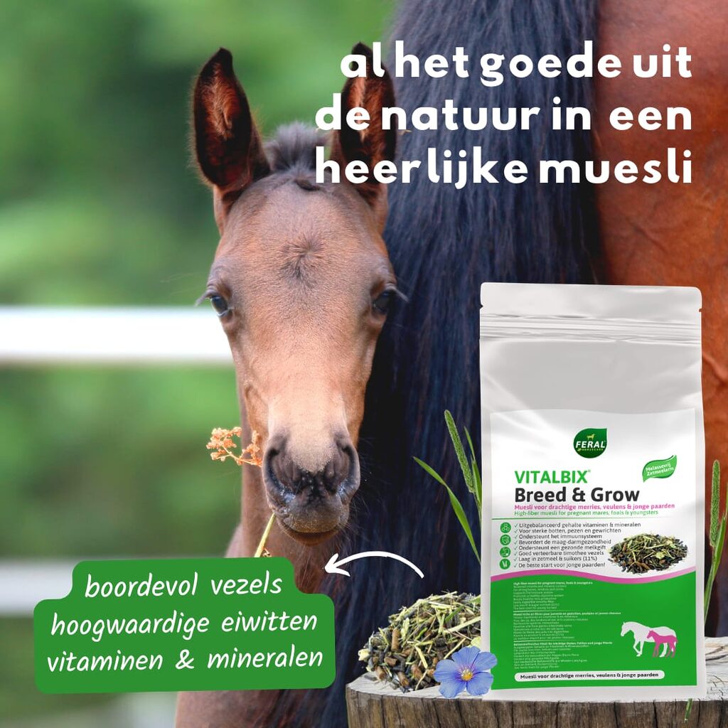 Vitalbix Breed & Grow is a unique, fiber-rich muesli formulated according to the latest insights in nutrition for pregnant mares, foals, young horses (up to approx. 3 years old), and stud horses. Breed & Grow is rich in fiber, low in starch and sugars, and contains a balanced content of easily absorbable vitamins, minerals, and trace elements.