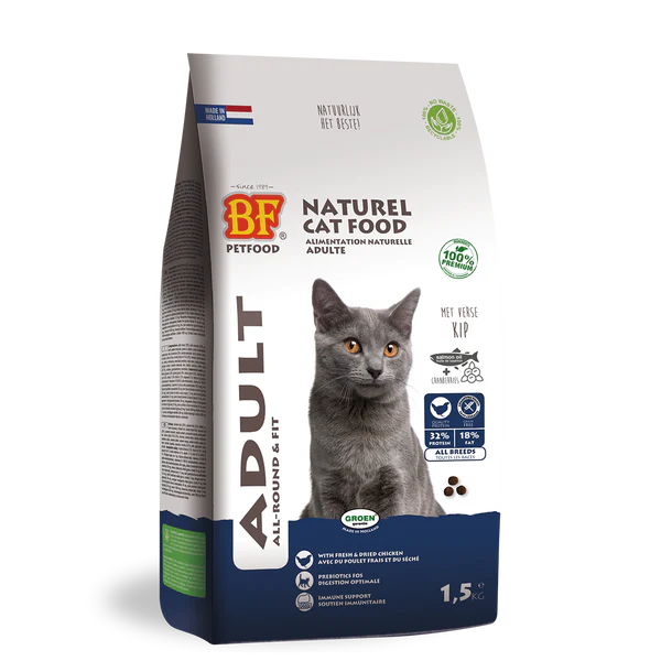 BF® Adult. Qualité supérieure néerlandaise. Alimentation premium naturelle, complète et de haute qualité, développée pour les chats adultes. Sans céréales et hypoallergénique. Avec une forte proportion de délicieux poulet, frais et séché. Avec huile de saumon, légumes, fruits, herbes et prébiotiques FOS (inuline). Sans céréales ni gluten. La levure, les fibres et les prébiotiques favorisent la digestion. Acceptation et digestibilité élevées.