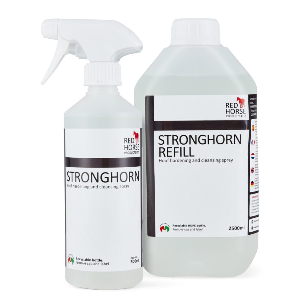 Stronghorn spray voedt en verhardt het hoornweefsel en is een krachtig hoefreinigingsmiddel.