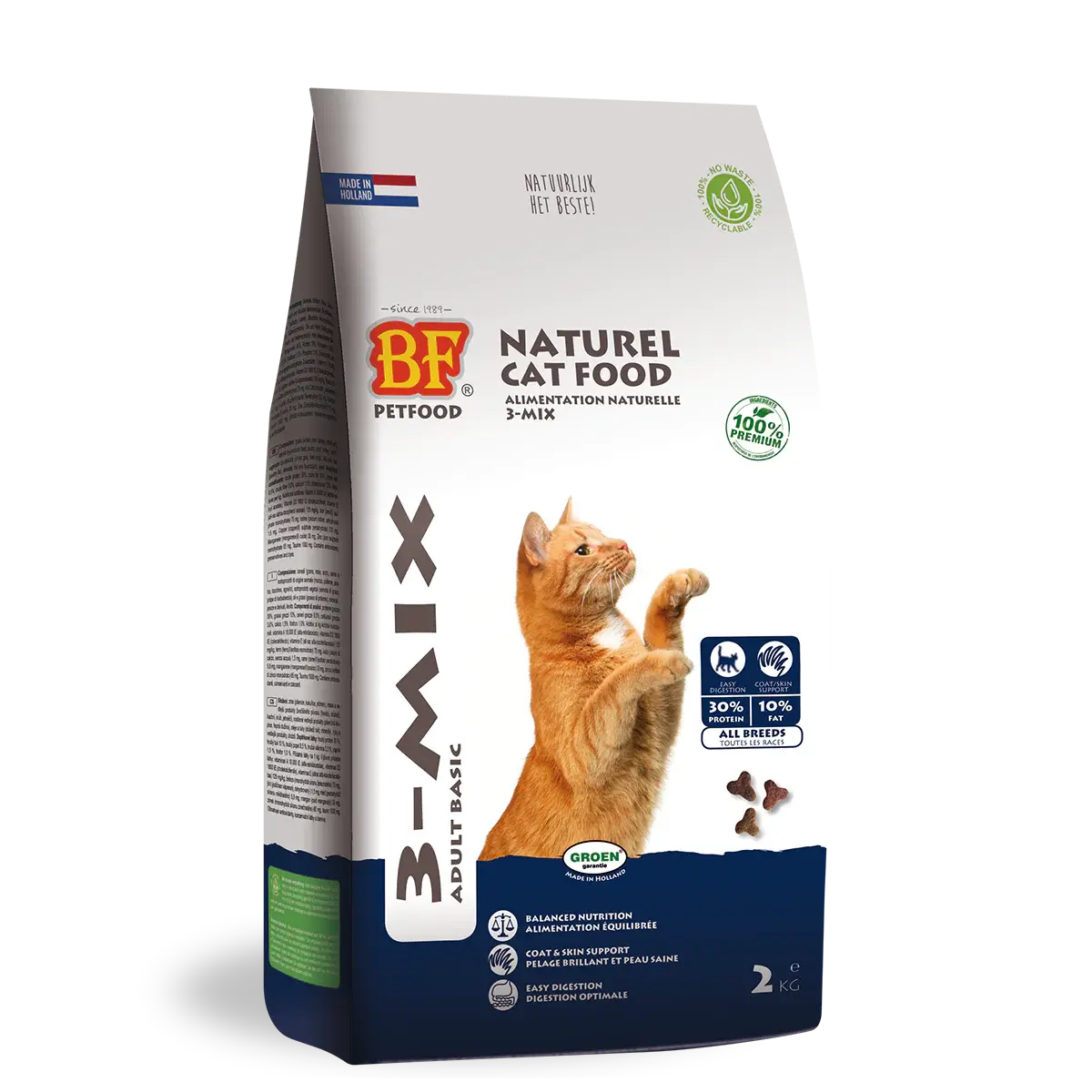 BF® Cat 3-Mix is carefully prepared with selected natural ingredients and contains multiple animal protein sources and the optimal daily amount of protein, fats, carbohydrates, vitamins and minerals. Yeast and fibre support digestion. These contribute to your cat’s overall health. For adult cats.