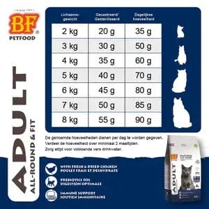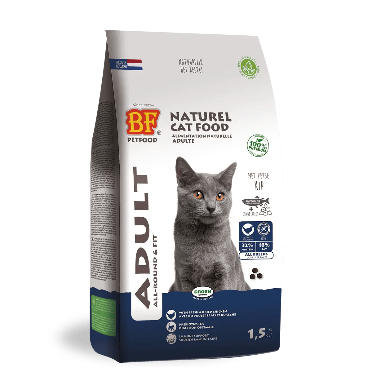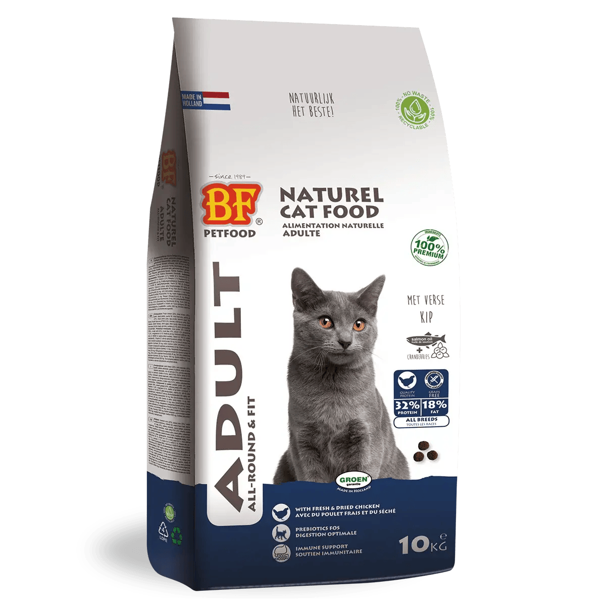 BF® Adult. Dutch top quality. High-quality, complete, natural premium cat food developed for adult cats. Grain-free and hypoallergenic. With a high proportion of delicious chicken, fresh and dried. With salmon oil, vegetables, fruit, herbs and prebiotics FOS (inulin). Grain- and gluten-free. Yeast, fibre and prebiotics support digestion. High acceptance and digestibility. Supports teeth, skin and coat, natural defences and reduces hairball formation. Reduces stool odour and volume and contains no artificial additives. For adult indoor and outdoor cats.