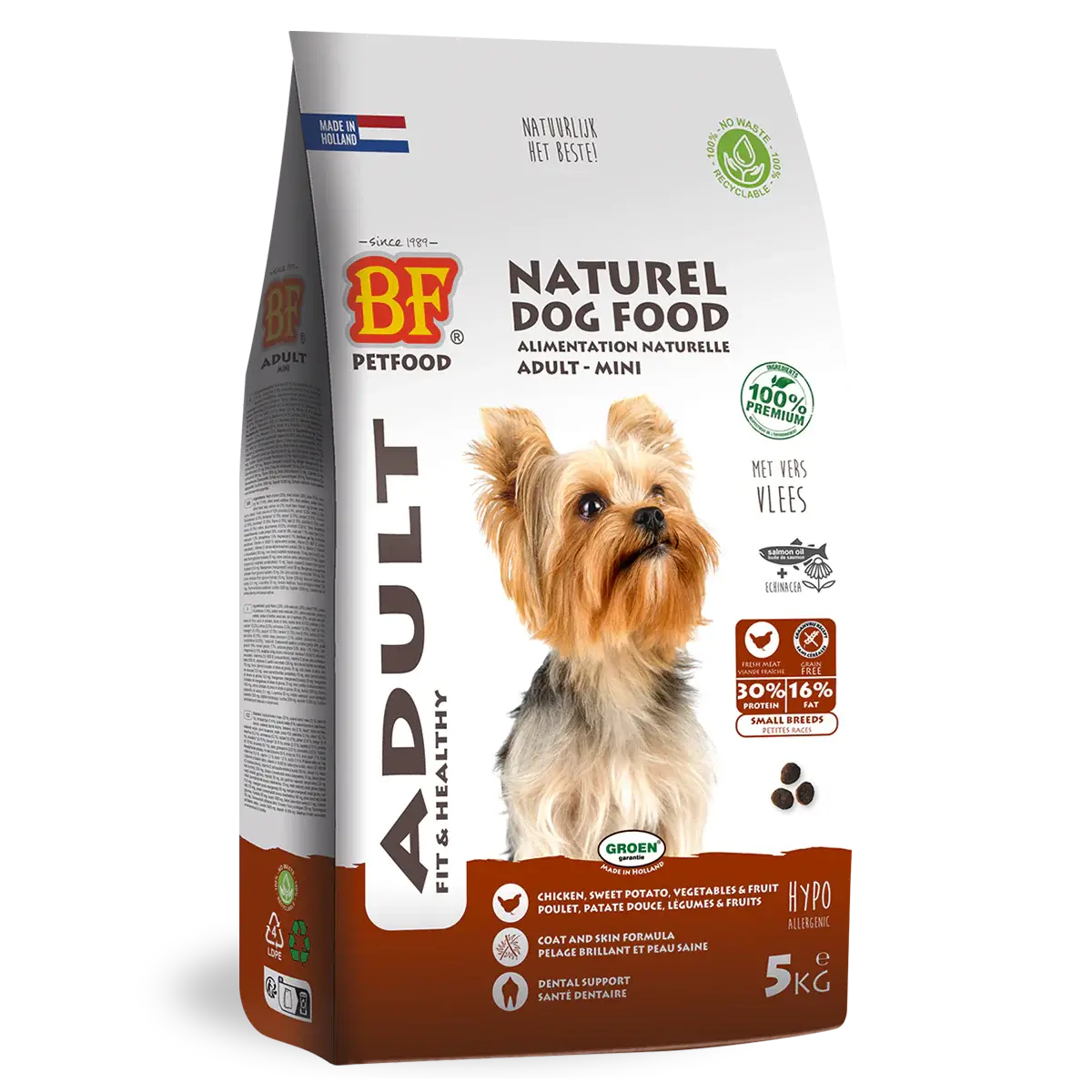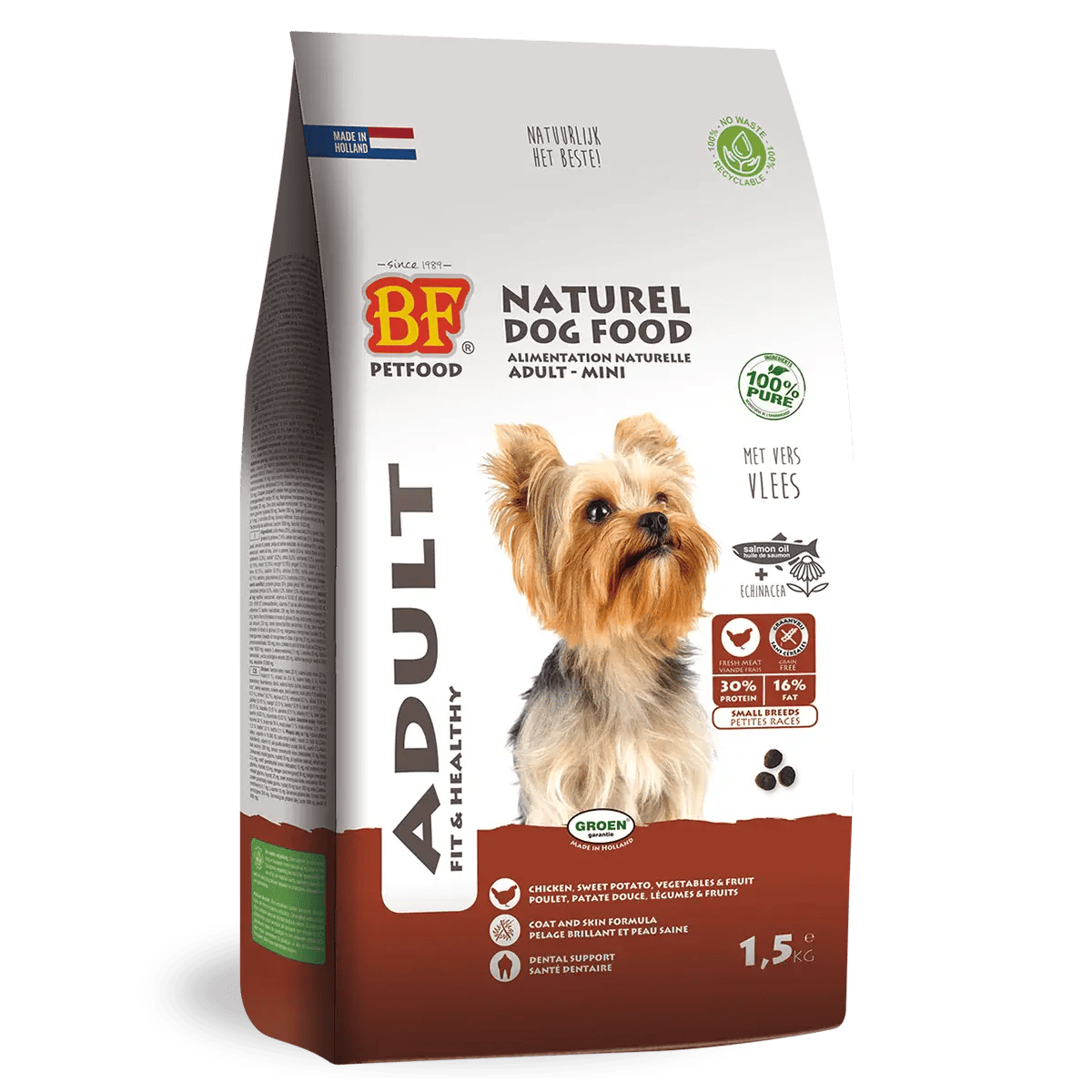 BF®Petfood, of which BIOFOOD® is a part, is the first pet food company in the Benelux to offer natural and organic pet food for dogs and cats in recyclable packaging.