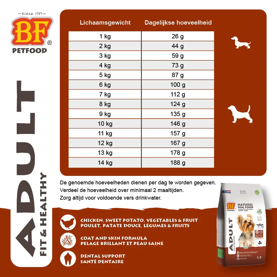 BF® Adult mini is a complete, easily digestible and very tasty grain-free natural dog food for adult dogs of small breeds. Rich in chicken, fresh and dried (40%). Grain- and gluten-free. With vegetables, fruit and herbs. Optimal kibble size, shape and structure. Yeast, fibre and prebiotics support digestion. High acceptance and digestibility. Supports skin and coat, immune system, joints and teeth. Inulin FOS (prebiotics) stimulates the intestinal flora and thus supports health. Healthy nutrition that ensures optimal digestion, stool and good condition for your dog. Reduces stool odour and volume. Suitable for all small dog breeds.