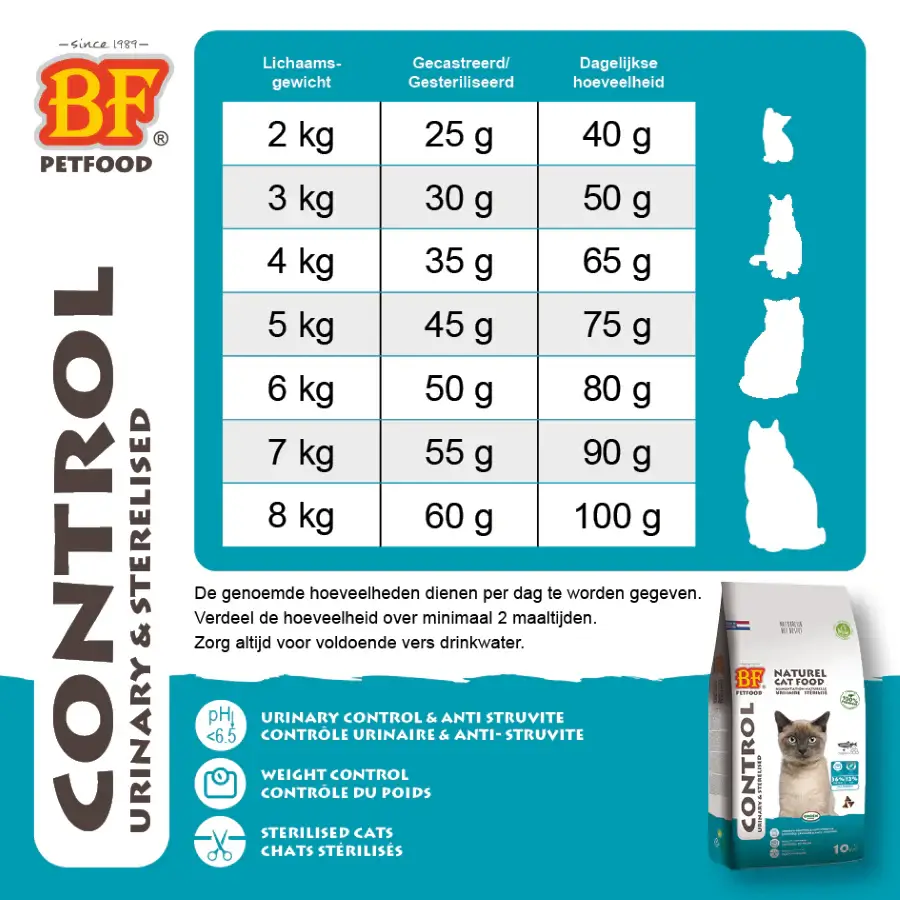 BF® Control – Urinary / Sterilised. Top Dutch quality. Complete, premium and natural cat food developed for adult cats to support the urinary tract (struvite*: struvite bladder grit and struvite bladder stones) and in cases of obesity (e.g. sterilisation). High proportion of animal proteins and low fat content. With prebiotics FOS (inulin). Contains an adjusted mineral ratio and is wheat-free. High acceptance and digestibility. Supports the urinary tract, is very suitable for overweight cats and reduces hairball formation. Low magnesium content and urine-acidifying properties. Developed to control urine pH (towards <6.5). Provides support by reducing the number of struvite-forming minerals to stimulate the prevention of struvite stone formation. This food has urine-desaturating properties for struvite. Yeast, fibre and prebiotics support digestion. Reduces odour and volume of faeces and contains no artificial additives. For adult cats.