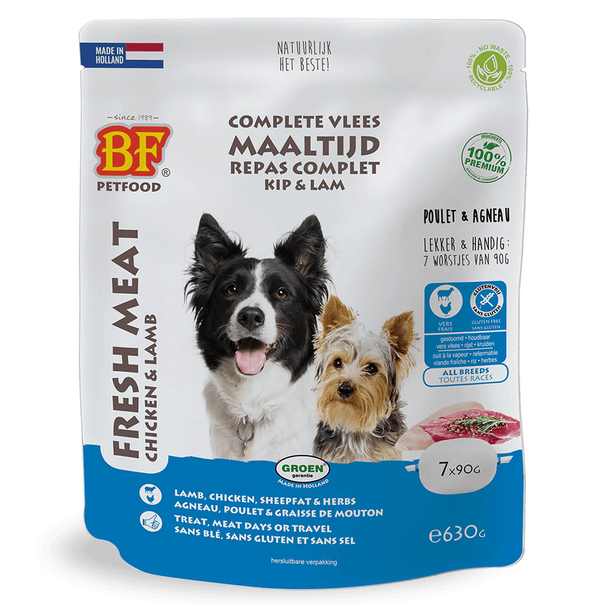 BF® Meat Food Chicken/Lamb. Complete and shelf-stable pure dog food based on fresh meat (lamb and chicken), organ meat, rice, sheep fat, and natural herbs. Gluten-free recipe. Our meat meals are slowly steamed with 100% fresh and natural ingredients. Ideal for meat days, as a treat, on the go, as a flavor enhancer, when switching to a different food, or for dogs that react poorly to dry food. Comes in resealable packaging and convenient portion packs (7x90g/630g). Suitable for every dog, from puppy to senior. Also available as an 800 g sausage.
