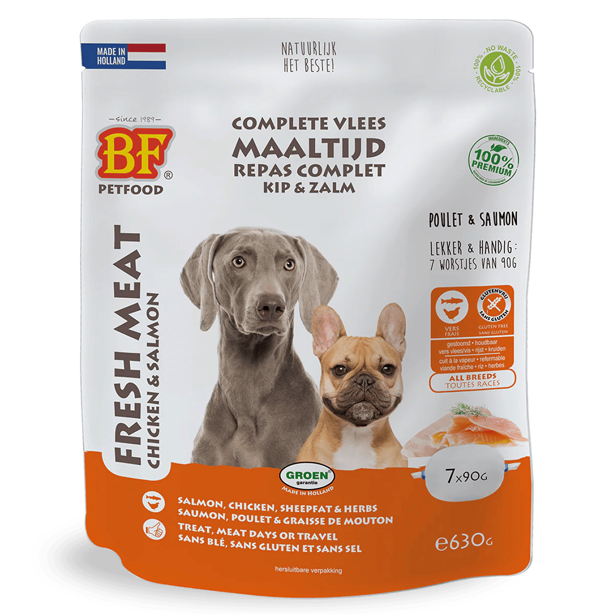 BF® Meat Food Chicken/Salmon. Complete and shelf-stable pure dog food based on fresh meat (chicken and salmon), organ meat, rice, sheep fat, and natural herbs. Gluten-free recipe. Our meat/fish meals are slowly steamed with 100% fresh and natural ingredients. Ideal for meat days, as a treat, on the go, as a flavor enhancer, when switching to a different food, or for dogs that react poorly to dry food. Comes in resealable packaging and convenient portion packs (7x90g/630g). Suitable for every dog, from puppy to senior. Also available as an 800 g sausage.