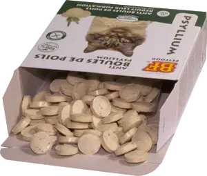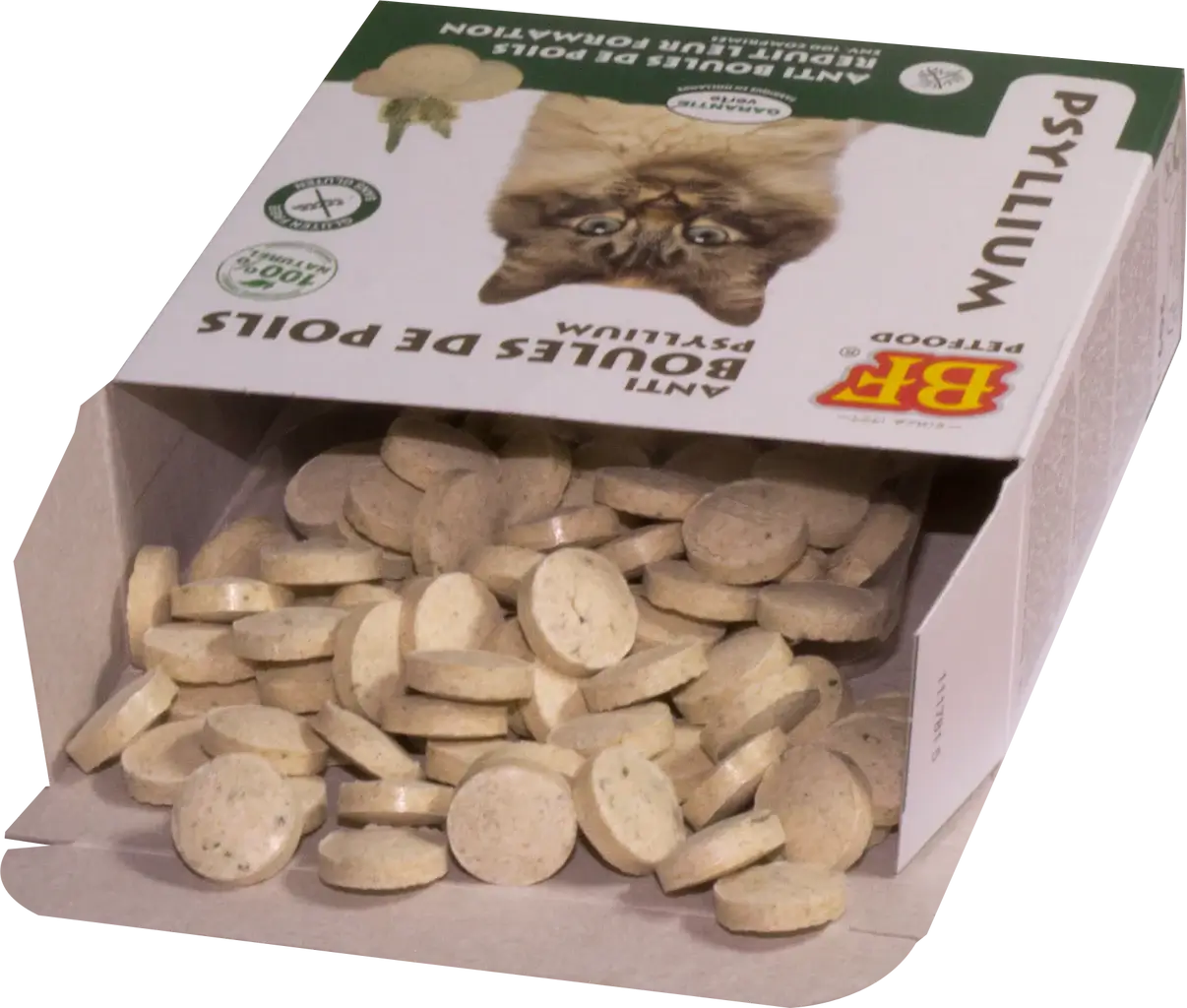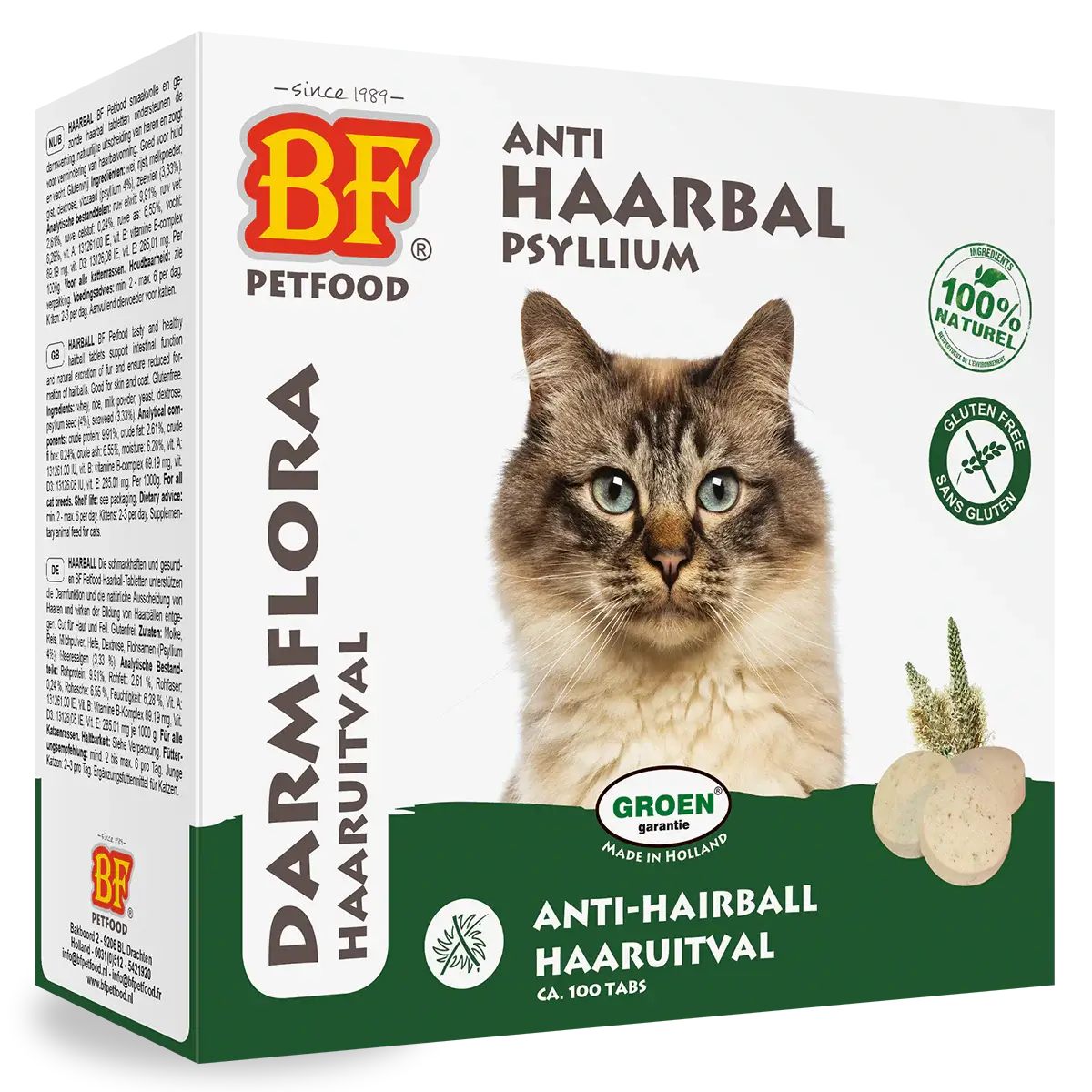 BF® tasty and natural anti-hairball yeast tablets with amino acids, vitamins (A, B, D and E), minerals and flea seed. Flea seed (Psyllium) supports intestinal function and ensures natural excretion of hair and reduction of hairball formation. In addition to vitamins, the anti-hairball tablets also contain high-quality amino acids, minerals, protein, enzymes and (beer) yeast. (Beer) yeast contains vitamin B (complex) and vitamin D, as well as high-quality and healthy amino acids, minerals, protein and enzymes. For all cat breeds, from kittens to seniors.