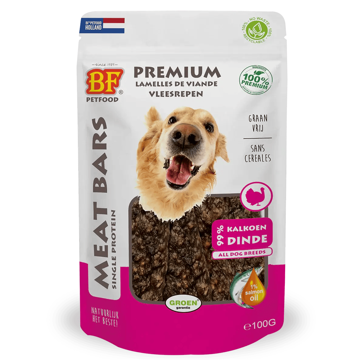 99% kalkoen en 1% zalmolie.