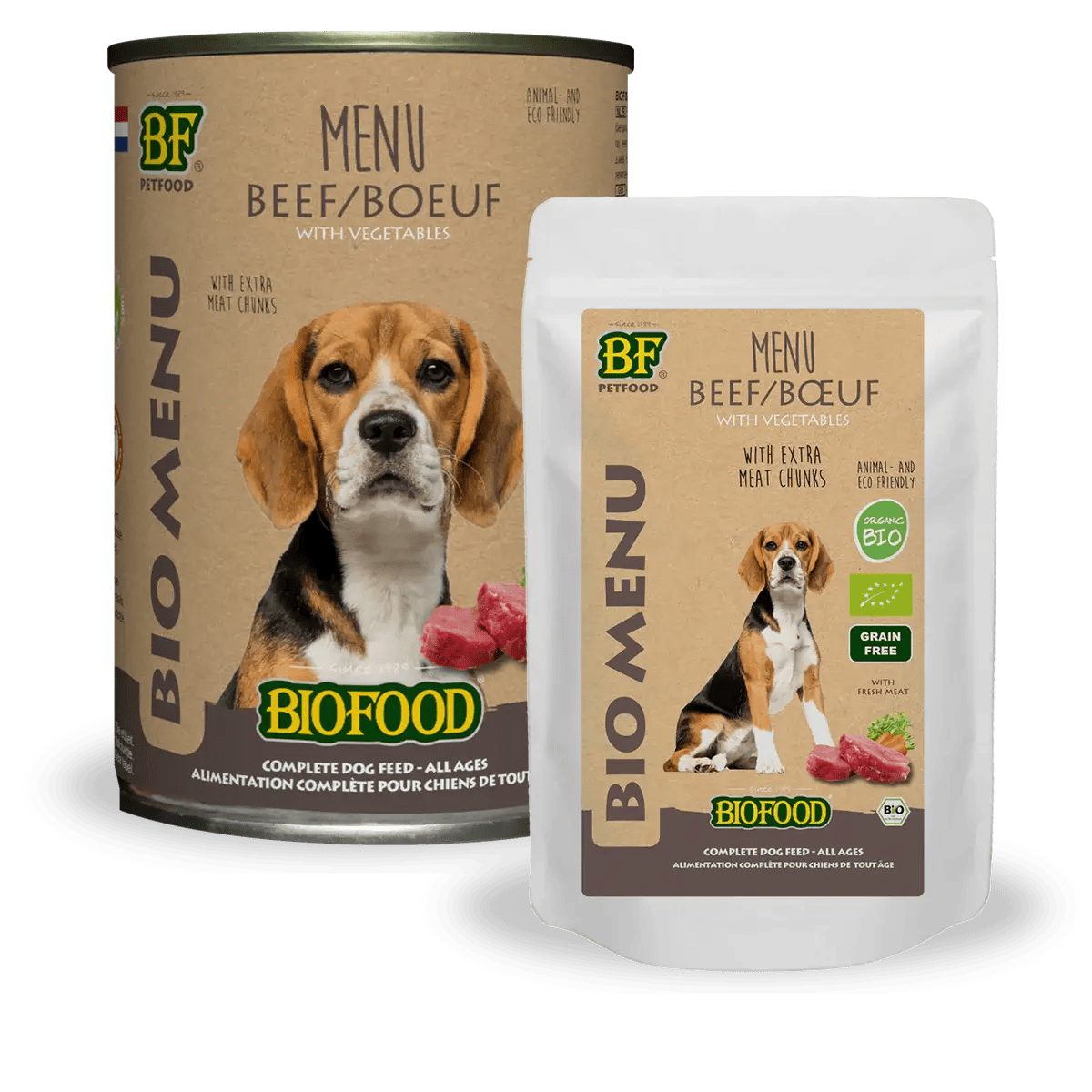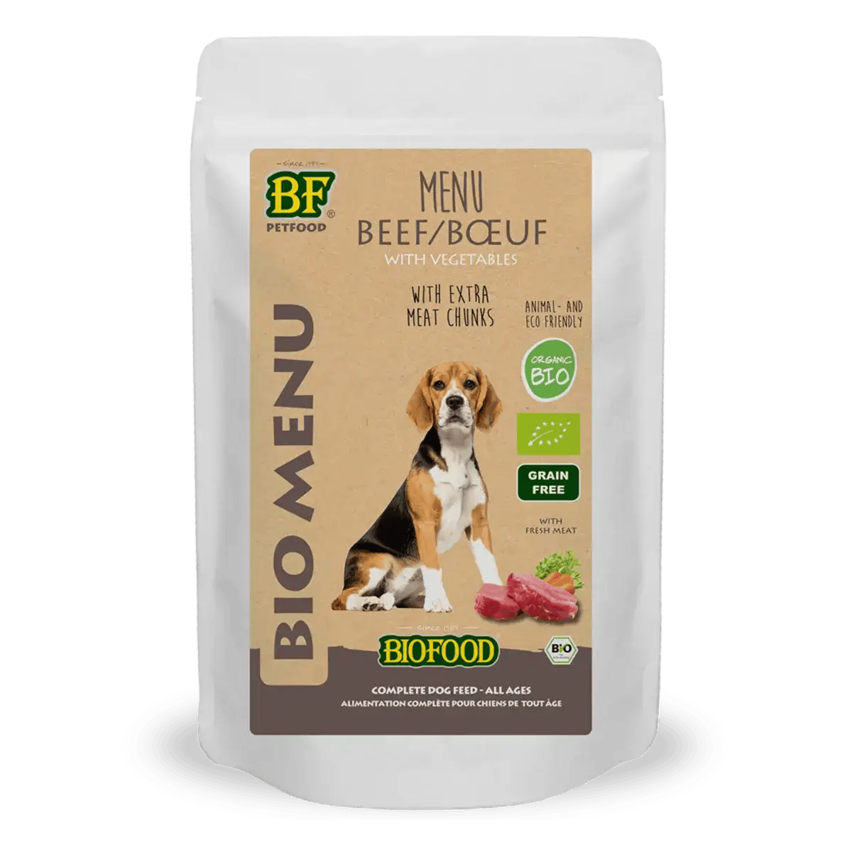 BIOFOOD® organic beef menu for dogs uses certified organic raw materials sourced from organic farmers. Animal and environmentally friendly. GMO-free, CO2-neutral production, no mass livestock farming and no added salt, sugar or other flavour, colour or taste enhancers. Suitable for all dogs.