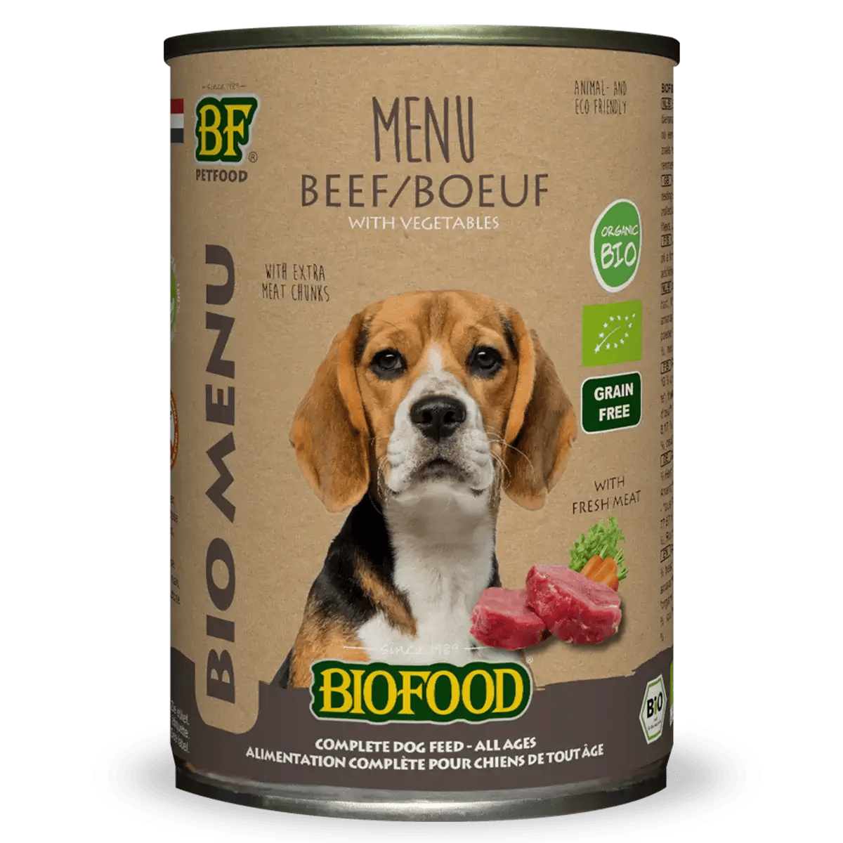 Complete organic grain-free wet food for dogs. 100% fresh organic beef and selected organic beef offal with organic carrots, celery, amaranth and an organic fruit mixture. Tasty and healthy complete organic meat food for every dog, from puppy to senior.
