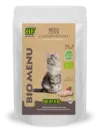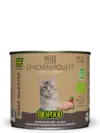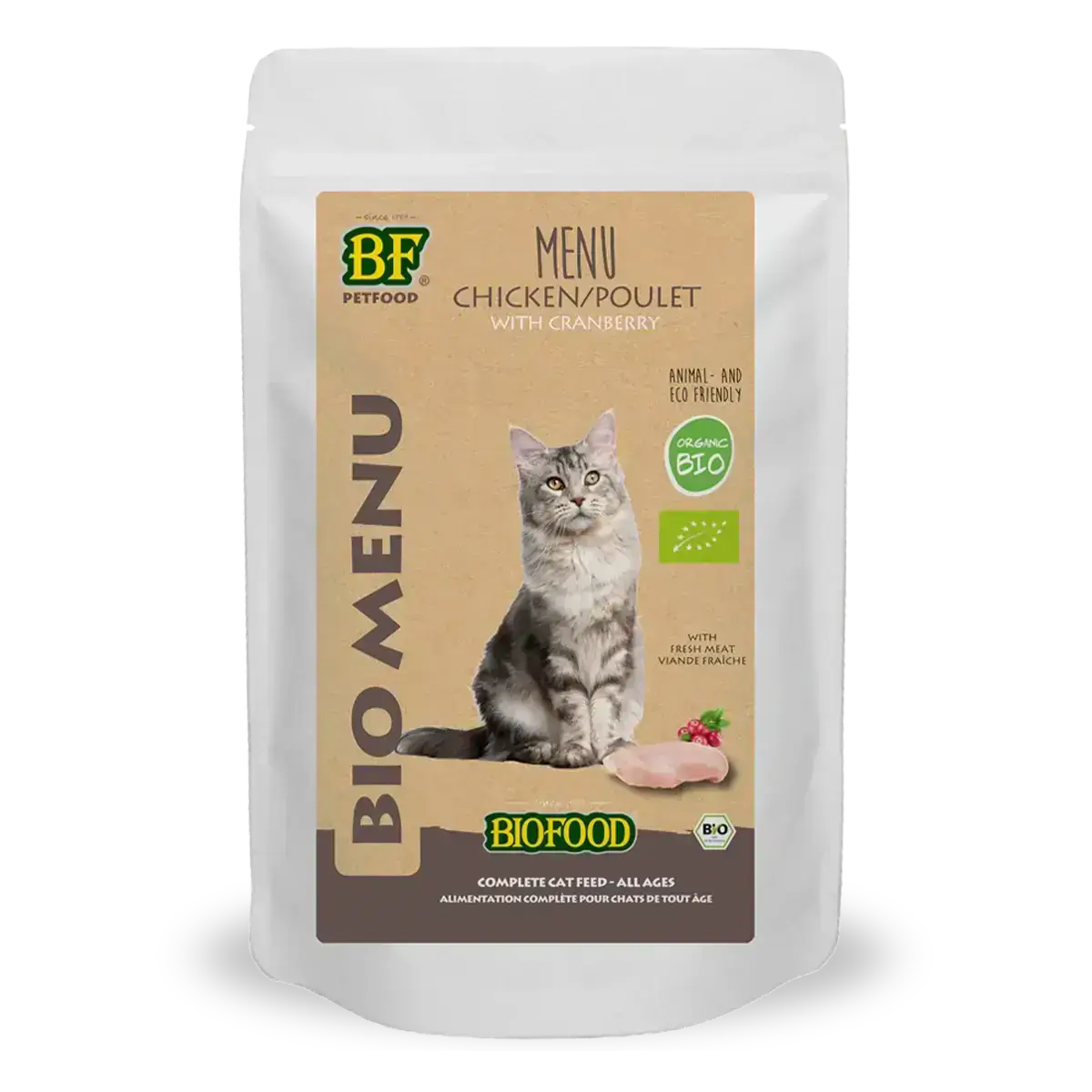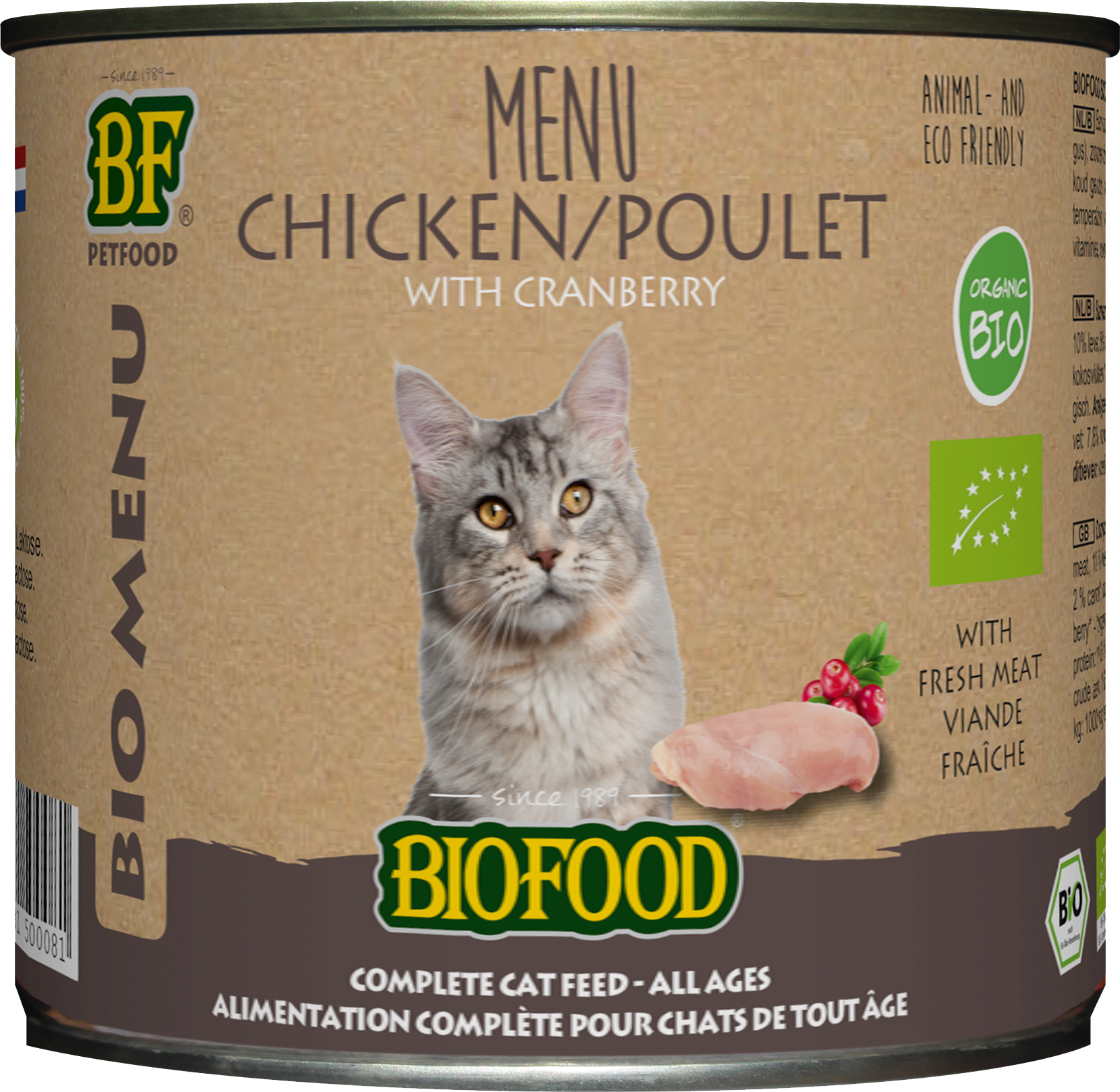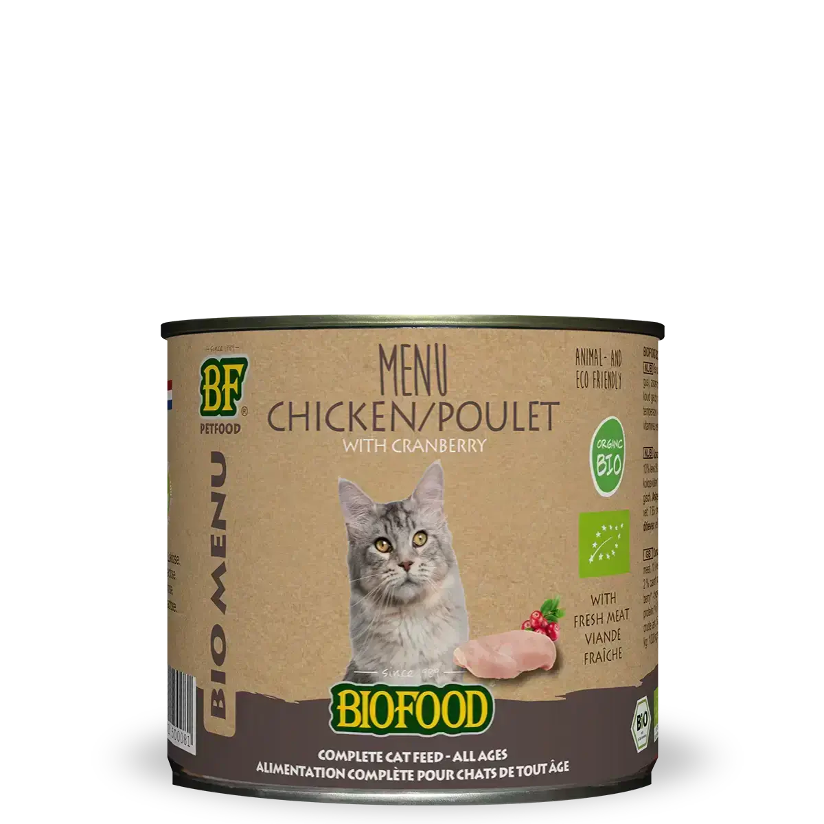 BIOFOOD® bio organic chicken menu is complete organic meat food for cats. Pure, delicious and healthy, low in gluten, highly palatable, easily digestible, hypoallergenic and supports skin, coat, digestion and kidneys. With only one source of animal protein, cold-filled, steamed at a controlled low temperature, free from additives such as artificial vitamins, fillers, binders or animal meal and animal testing.