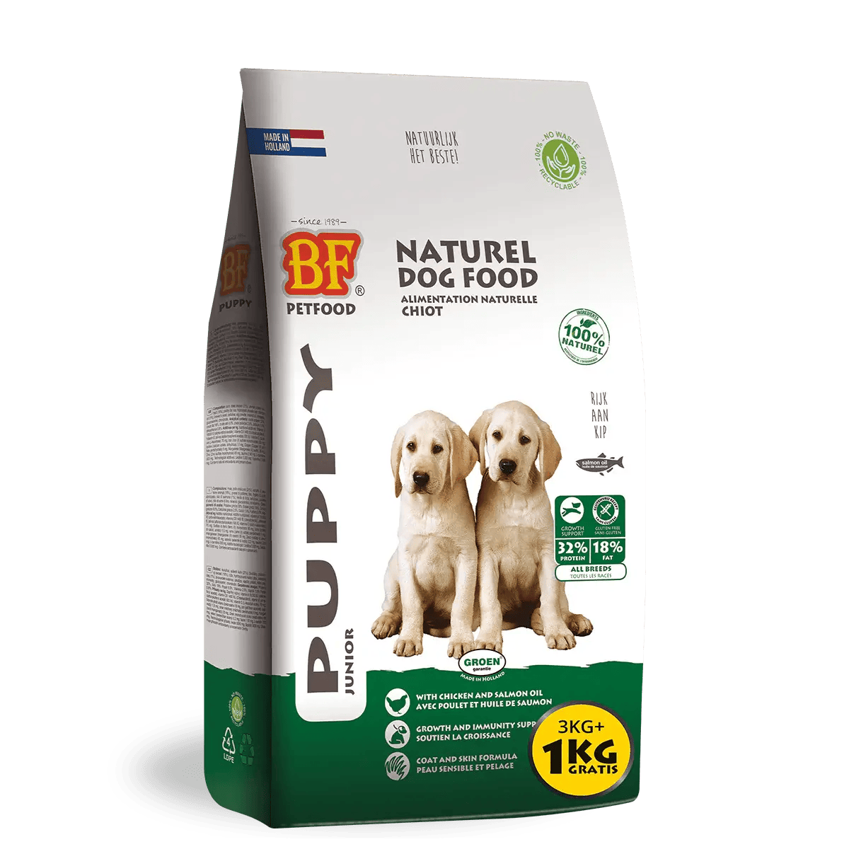 BF® Puppy is an energy-rich, tasty food specially formulated for puppies and young dogs. With more than 40% dried chicken, beef and turkey meat, it provides a powerful energy boost of 4200 kcal per kg. Pure Dutch top quality, made with high-quality natural ingredients.