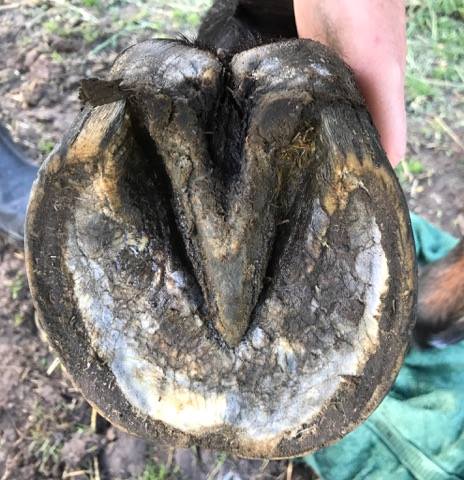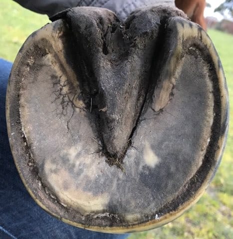 ‘Spencer’ a 10 year old ex-racehorse, in Australia, was purchased with very contracted heels, associated deep central sulcus cracks and widespread hoof infection.