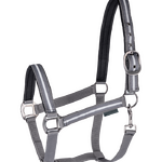 Modern halter with reflective stripes on the noseband, cheekpieces as well as on the headpiece. Fittings and padding in contrasting colour. Adjustable on one side of the headpiece.