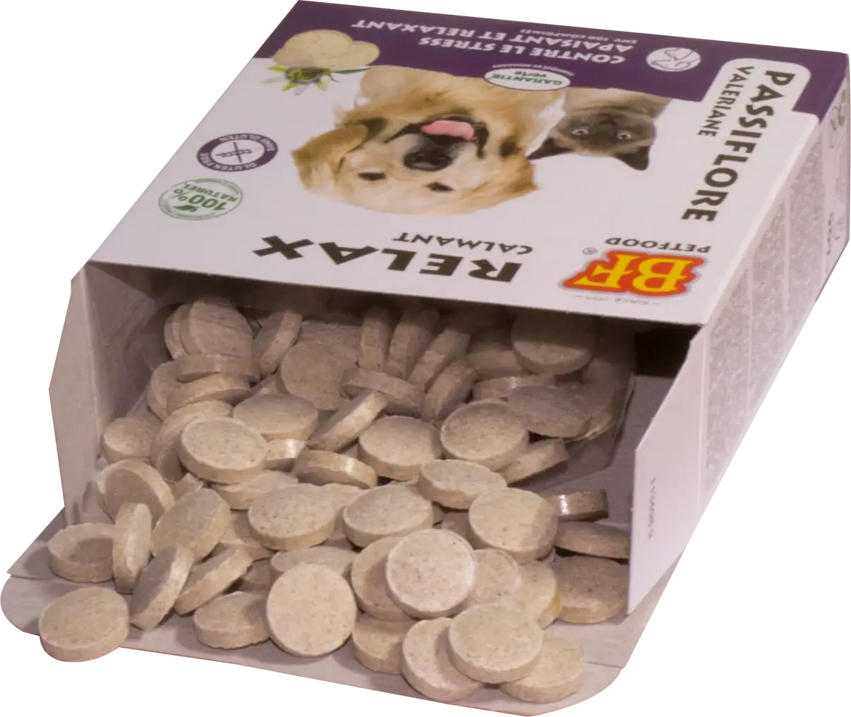 Tasty, natural and soothing BF® Relax yeast treats for dogs and cats. With amino acids, vitamins (A, B, D and E), minerals, valerian and passion flower, which have a positive effect on serotonin metabolism and provide a calming and soothing effect. Healthy for skin and coat. Calming and soothing effect in case of: fireworks, thunderstorms and stress. In addition to vitamin B (complex) and vitamin D, the (beer) yeast also contains high-quality and healthy amino acids, minerals, proteins and enzymes. Optimal effect with daily use. Can be used all year round. For all breeds of dogs and cats.