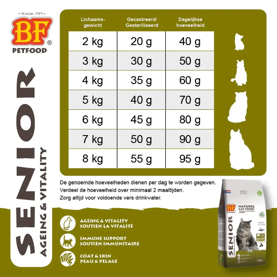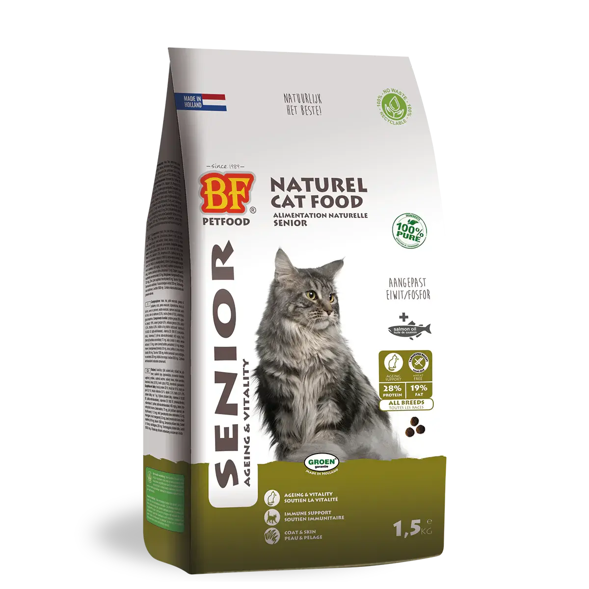 BF® Senior. High-quality, complete, natural premium cat food developed for older cats and adult cats with sensitive kidneys. Reduced protein, phosphorus and sodium content and adjusted mineral ratio. Wheat-free. Fibre and prebiotics support digestion. High acceptance and digestibility. Supports mobility, ageing, kidneys, weight, skin and coat, stomach and intestines and reduces hairball formation. Inulin FOS prebiotics stimulate the intestinal flora and thus support health. Limits odour and volume of faeces and contains no artificial additives. Also suitable for cats with kidney disease and oxalate stones. For older cats and adult cats with sensitive kidneys.