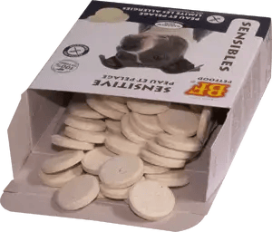 BF® Sensitive (hypoallergenic) natural yeast tablets for dogs, with amino acids, vitamins (A, B, D and E) and minerals, contain tasty and healthy ingredients. Reduces the occurrence of allergic reactions. In addition to vitamin B (complex) and vitamin D, the (beer) yeast also contains high-quality and healthy amino acids, minerals, proteins and enzymes. Supports the skin, coat, defence and immune systems. For all dog breeds.