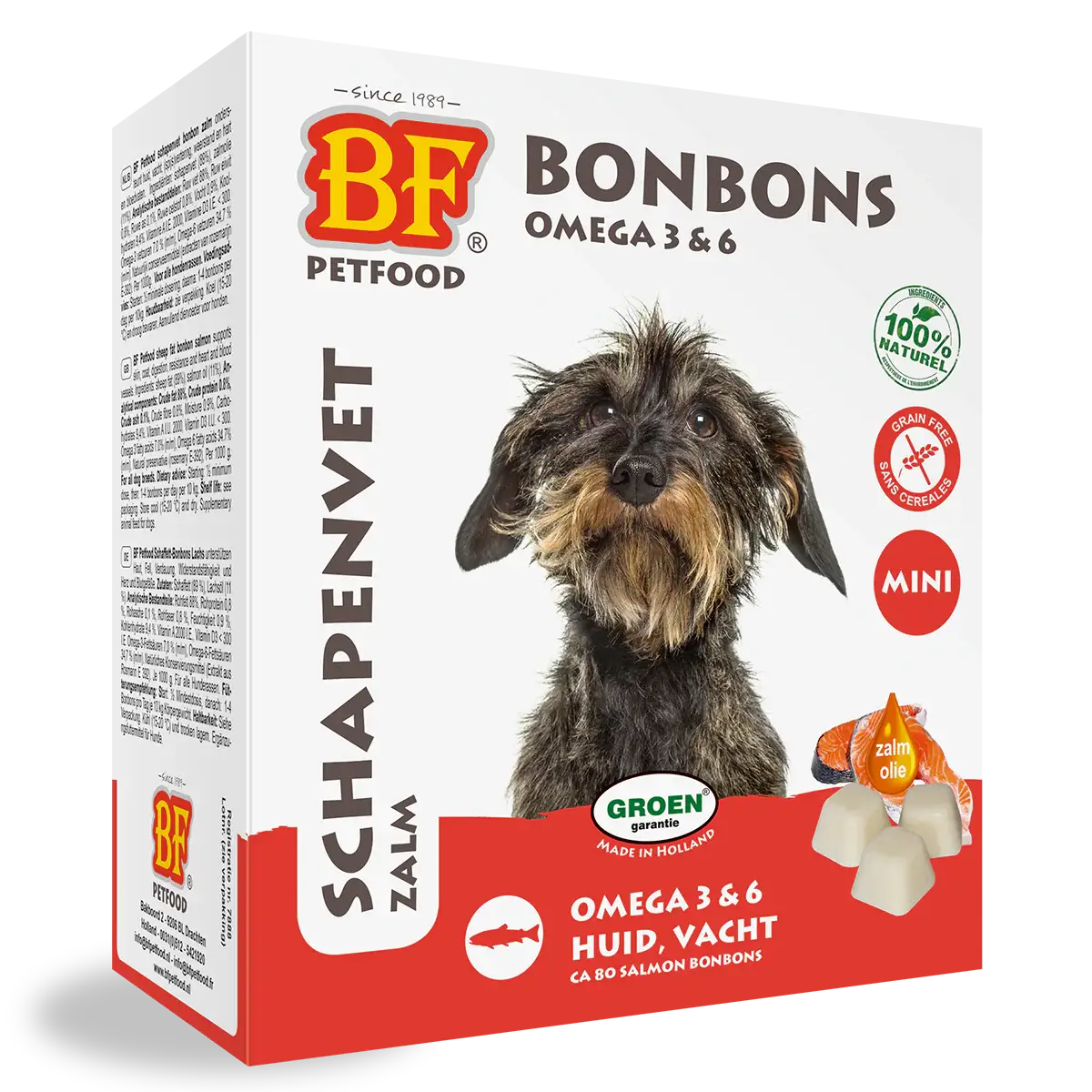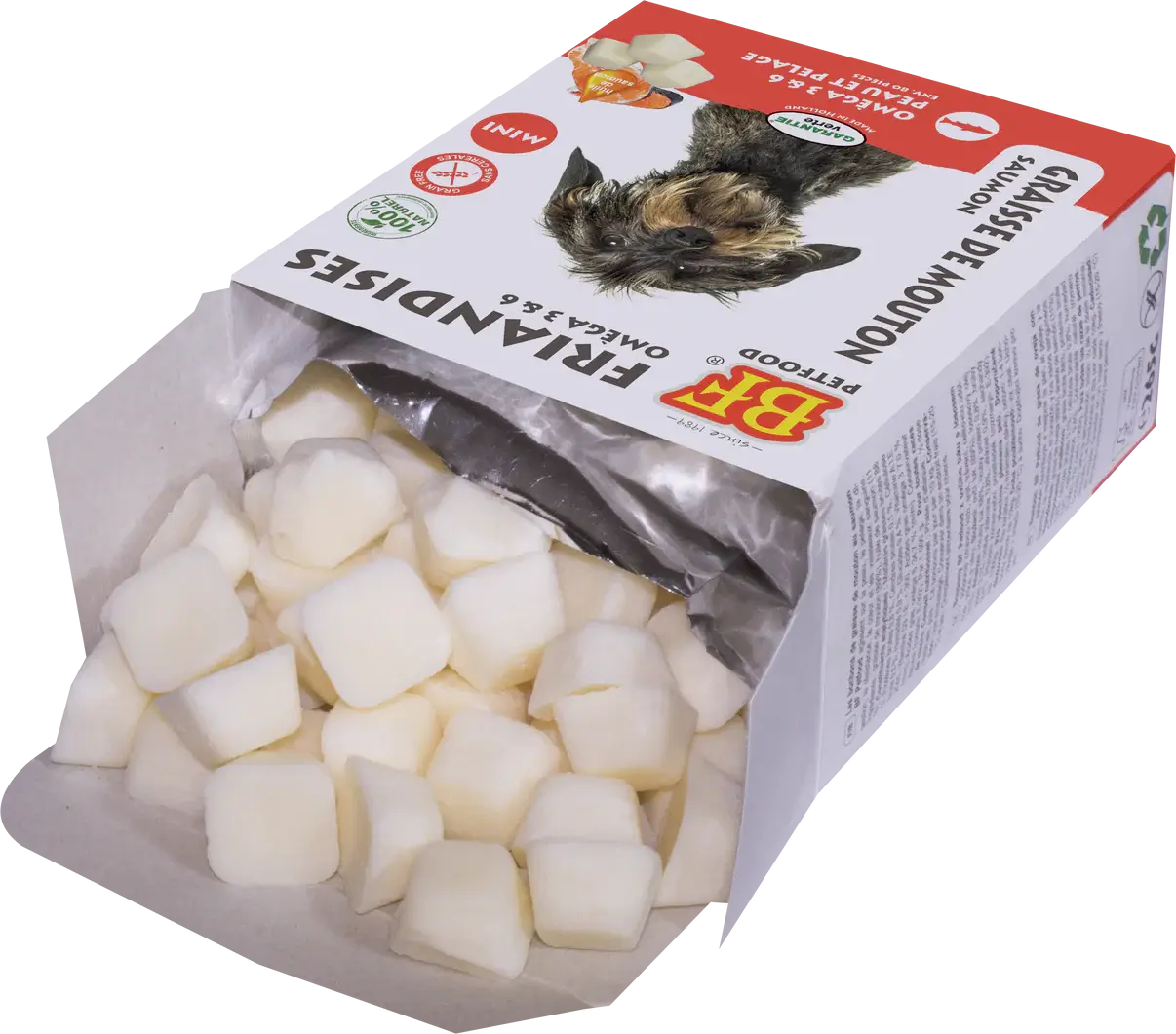 The original BF® sheep fat bonbon with salmon oil is a natural and highly effective remedy for supporting skin, coat, digestion and immunity. It is also an exceptionally healthy and tasty addition to your dog’s daily diet. The salmon bonbon is rich in omega 3 and 6 fatty acids. Supports skin, coat, heart and blood vessels. Also suitable for dogs with food allergies that are on a lamb-based diet.