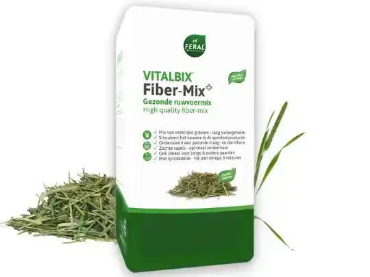 Vitalbix Fiber Mix is a unique roughage mix of healthy grasses with a low sugar content and timothy structure pellets, supplemented with 3% linseed oil.