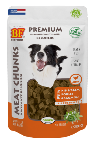 De BF®Petfood Meat Chunks Kip/Zalm zijn heerlijke, gezonde licht verteerbare krokante premium beloning- of trainingssnacks voor uw hond. De krokante beloners zijn rijk aan kip en Schotse zalm met daarnaast een vleugje van onze gezonde en smaakvolle kruiden. Gluten- en graanvrij, 100% natuurlijk en geen kunstmatige toevoegingen. Ondersteunt het gebit. Tijdens het kauwen wordt endorfine aangemaakt, dit zorgt voor een rustig gevoel, waardoor de hond zich (meer) ontspant. Het droogproces voor deze snacks gebeurt op duurzame wijze. Dit alles met zo weinig mogelijk afvalproductie en CO2 uitstoot. Ideaal voor het versterken en belonen van goed gedrag of als verantwoord tussendoortje voor uw hond.